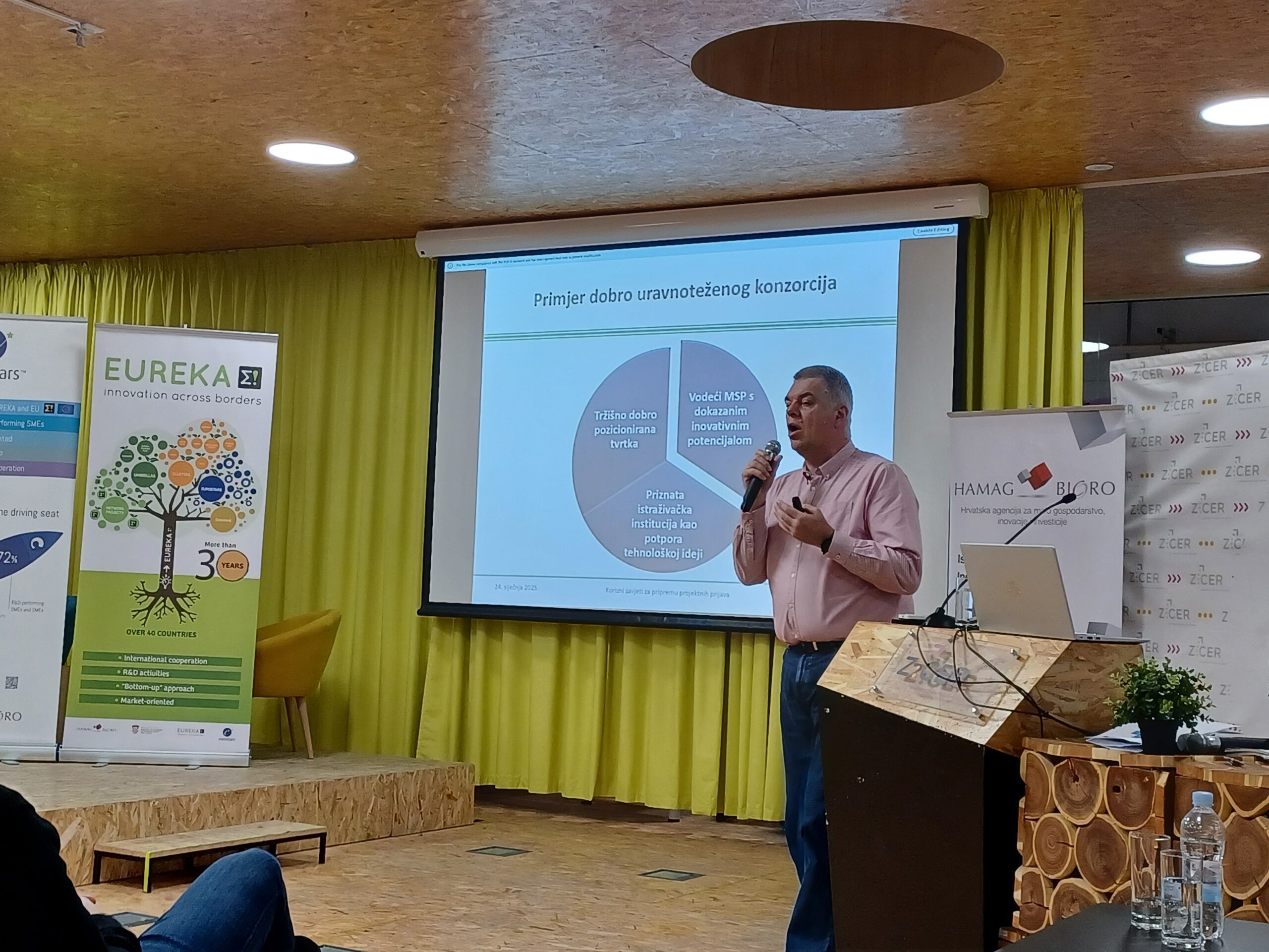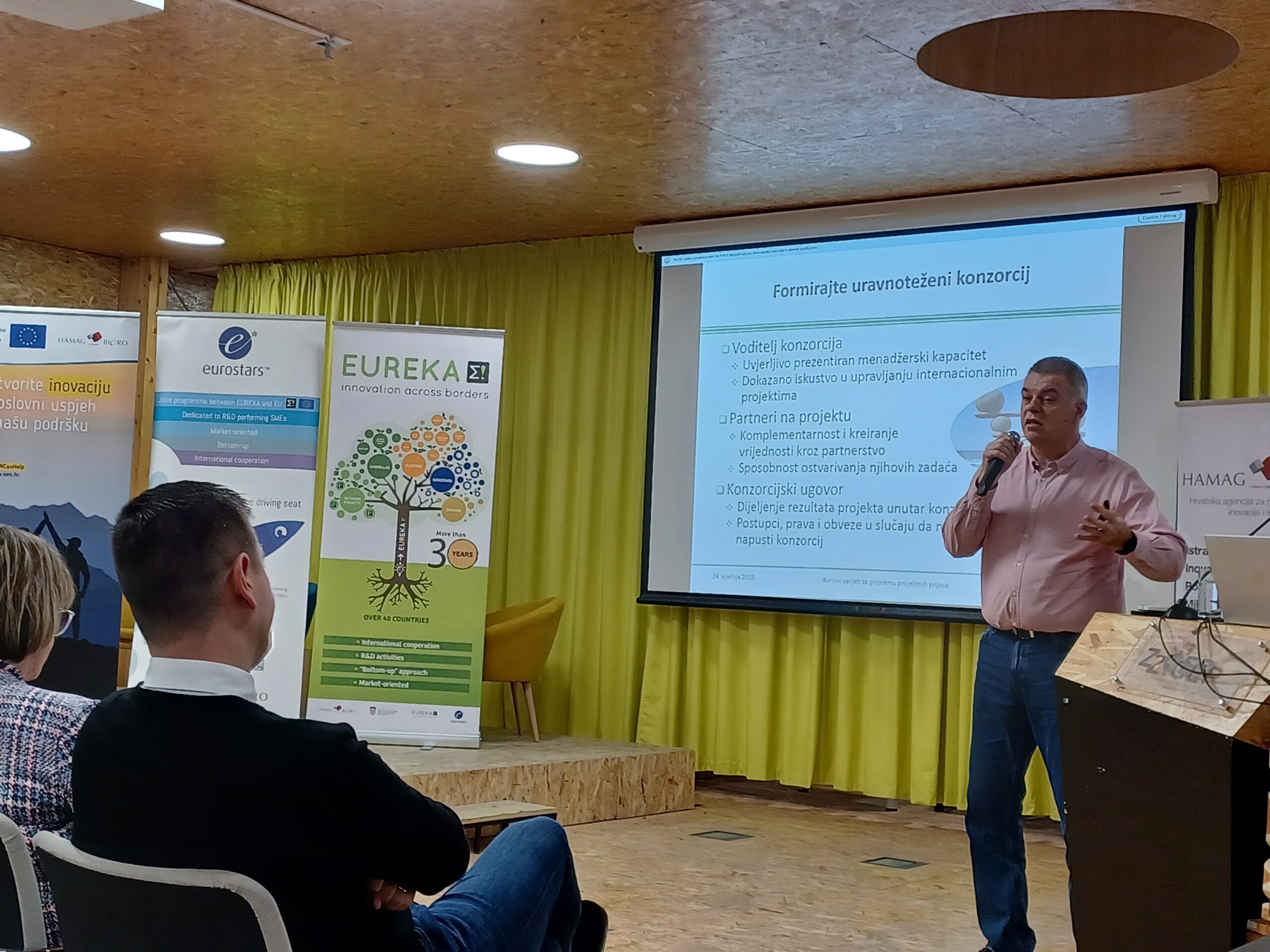 Korisne savjete za pripremu projektnih prijedloga sudionicima je pružio Nenad Buljan iz evaluacijskog odbora Eureka mreže. Okupljenima je objasnio idealan konzorcij za Eurostars i prošao kroz najčešće greške u projektnim prijavama.